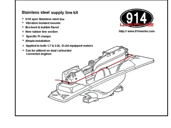 One design flaw on D-Jet equipped motors was routing the feed line over the top of the motor from rail to rail. Originally that rubber line was clad in a plastic sheath to protect from the heat & elements. The reason this "design" is problematic is this spot atop the case gets very hot. With OE routing you ARE heating fuel being fed to injectors. 914werke offers a simple kit that solves this issue. It re-routes that fuel line using a pre-bent & flared stainless line in front of the impeller housing. This location has the secondary benefit of being located in the stream of air being sucked into the Impeller, cooling the contained fuel instead of heating it, & limiting the amount of perishable rubber in the engine bay!